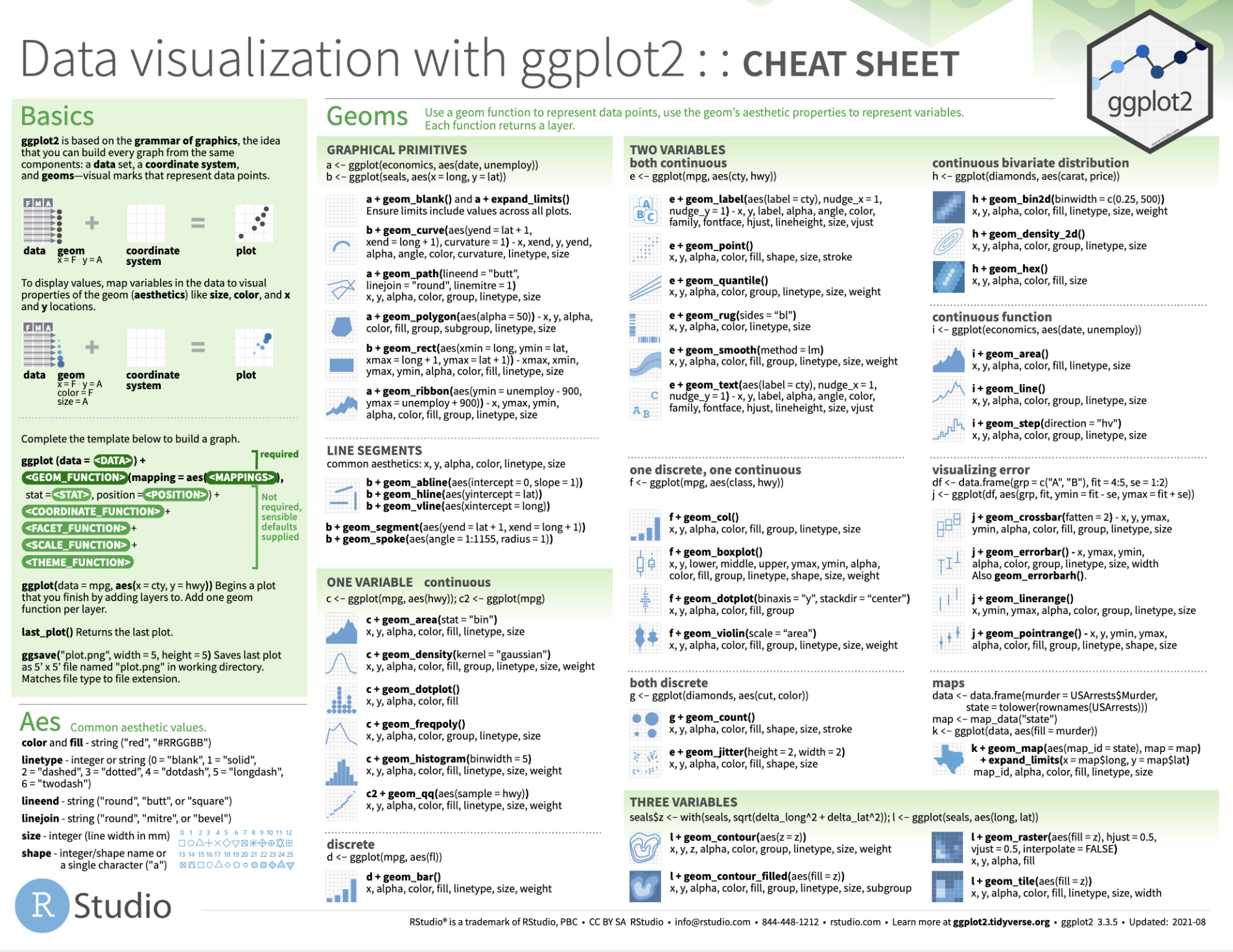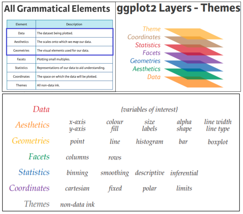 - Geometry: The type of plot (scatterplot, boxplot, barplot, histogram, qqplot, smooth density, etc.)
