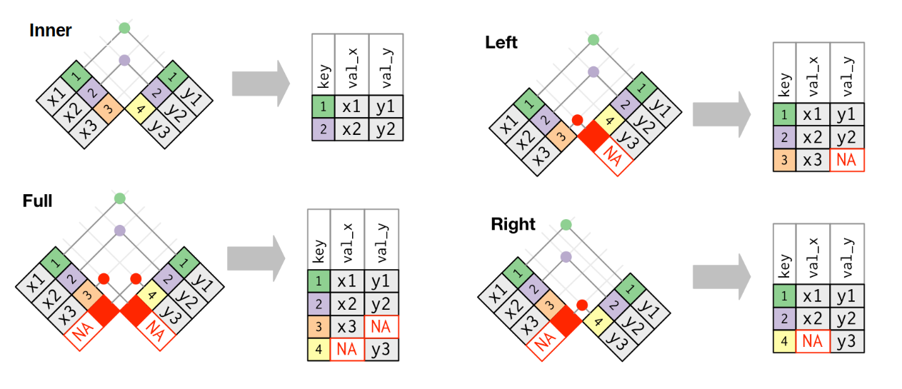A right_join keeps observations that are present in the right (second) table, dropping those that are only present in the other